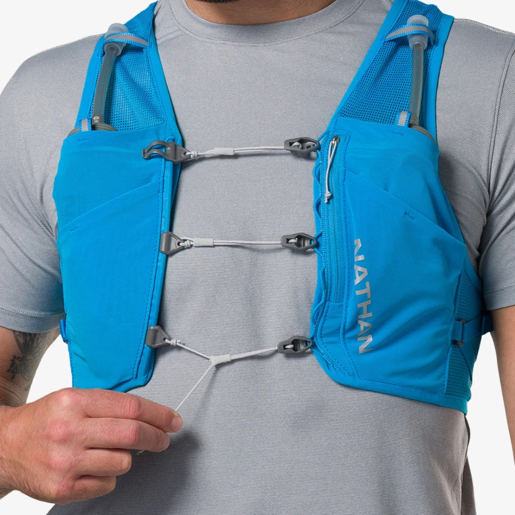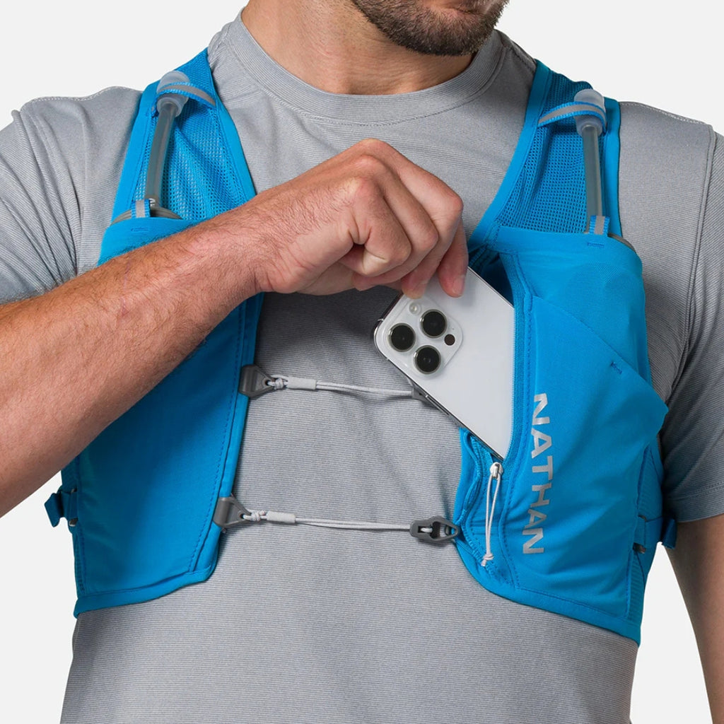 The Pinnacle Breeze features sternum slider cords and Quick-Fit™ adjustment system, wrapped in lightweight mesh for unmatched comfort. It comes with two 14oz/420 ml Nathan Hydrapak flasks and six pockets, providing a perfect blend of support, airflow, and storage.